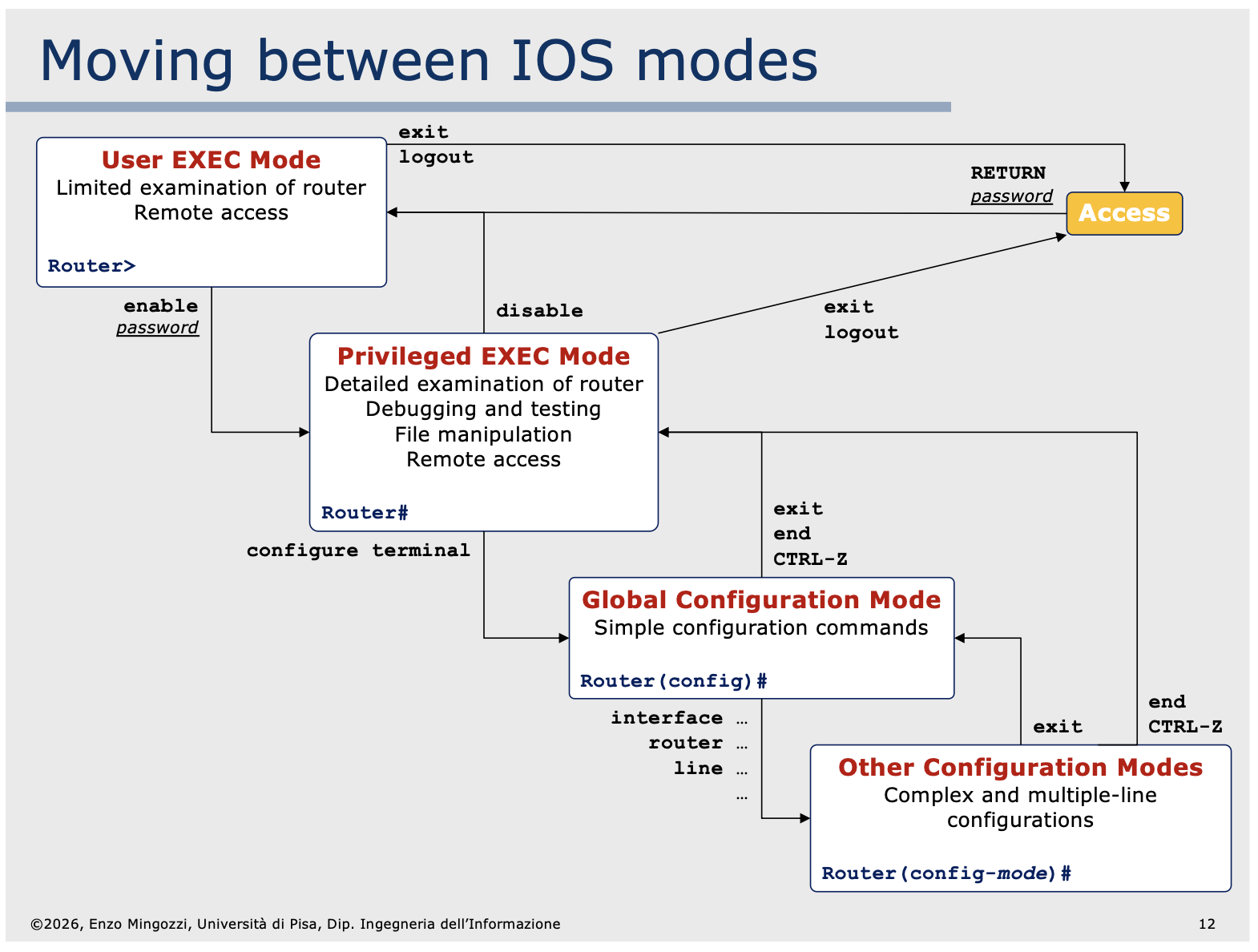 Cisco IOS (e la maggior parte delle alternative) utilizza una interfaccia modale, in una determinata modalità è disponibile solo un sottoinsieme dei comandi ed un certo livello di privilegio.