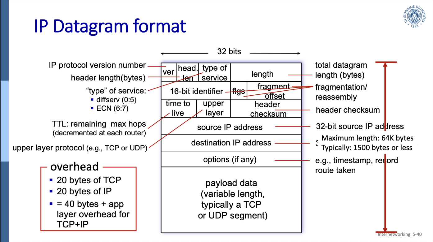 - TTL: time to live, maximum number of forwards in routers before being dropped. It is decremented at each router.