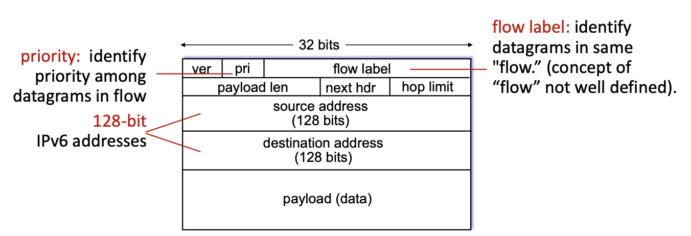 This was introduced because 32 bits are not enough (IPv6 uses 128 bits) and an additional motivation was to speed up processing/forwarding: instead of a variable length header with IPv6 we can use a 40 byte fixed length header. Also this enables different network-layer treatment of “flows”.3.4.1 IPv6 datagram format