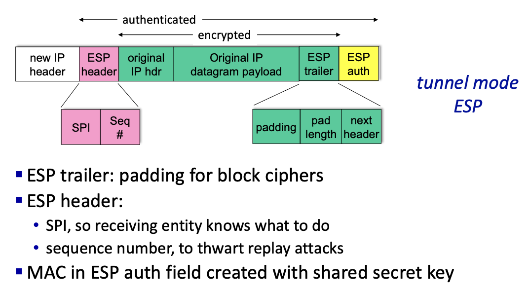 - tunnel mode: the entire datagram gets encrypted and authenticated, and the encrypted datagram is encapsulated in a new datagram, with a new IP header, tunneled to the destination.