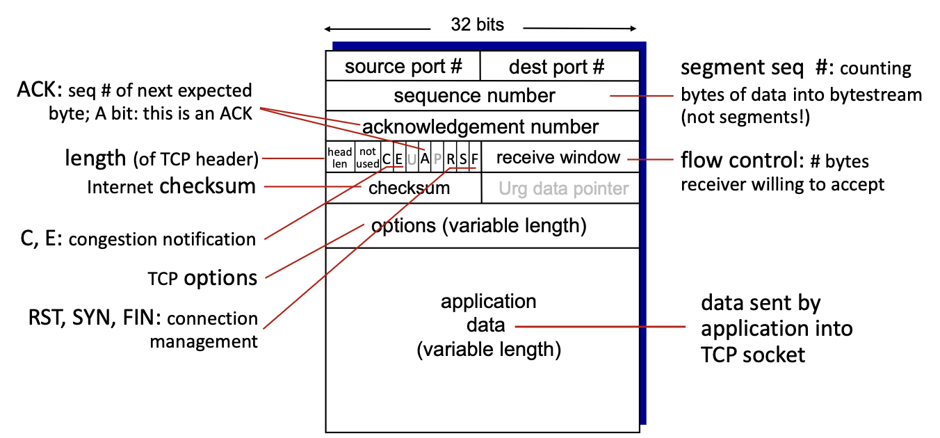 - lost segment: either perceived by timeout or 3 duplicate ACKs: assume loss due to congestion: decrease sending rate