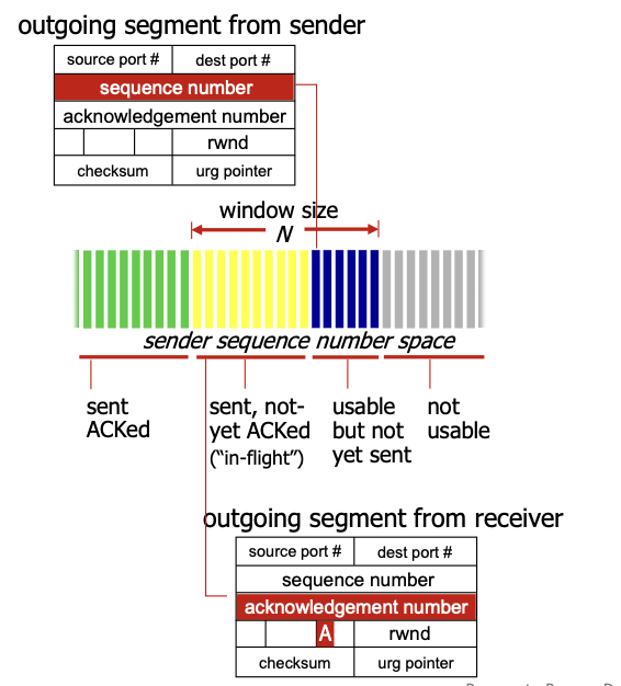 - receive window: used to repeatedly tell the other end how many bytes are free in the receiving window