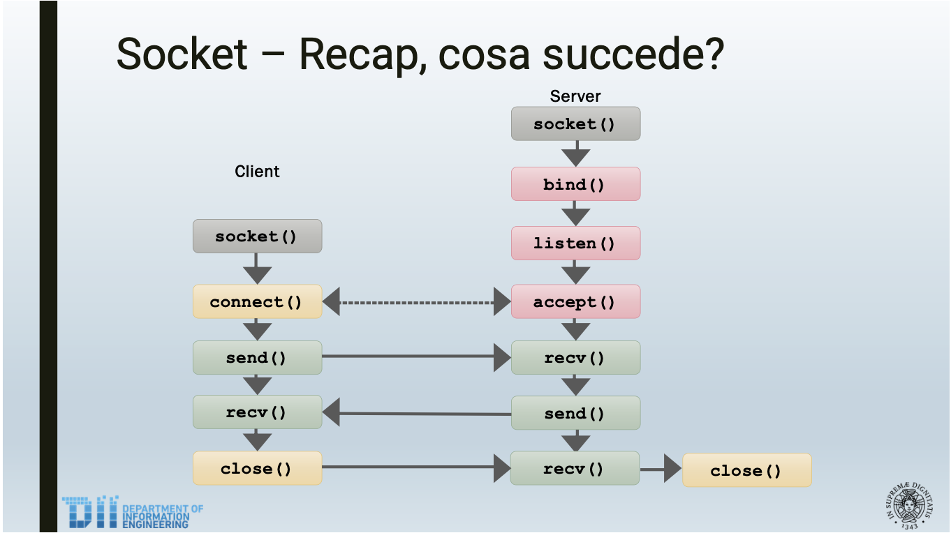 ssize_t recvfrom(int sockfd, const void *buf, size_t len, int flags, struct sockaddr *src_addr, socklen_t addrlen);- sockfd: descrittore del socket